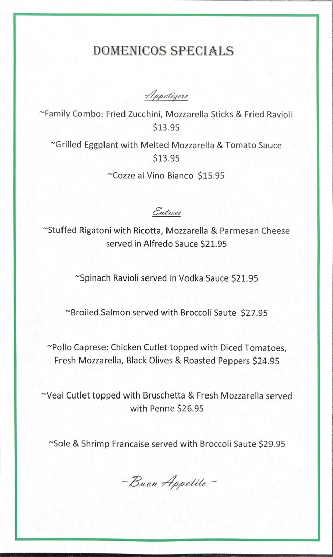 JOIN OUR TEXT CLUB TEXT Domenicos to 844- 889-1888